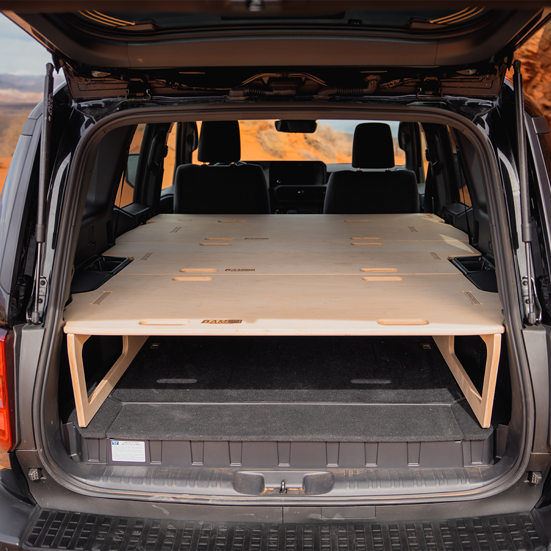 The BamBed for the Land Cruiser (2024+) is a tailored-fit bed platform designed to maximize both storage and utility for your adventures. The structurally efficient design offers a huge amount of storage space for gear underneath, and provides a 6'2" long platform for sleeping. This platform is rapidly removable, ensuring you get the most out of your Land Cruiser without sacrificing comfort or versatility.