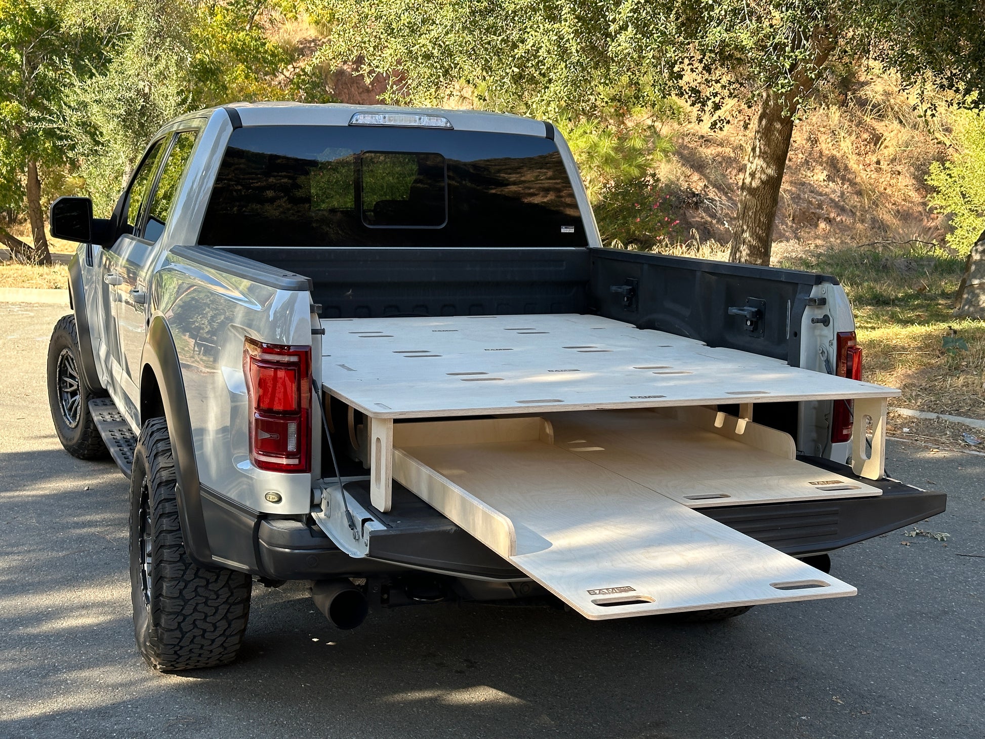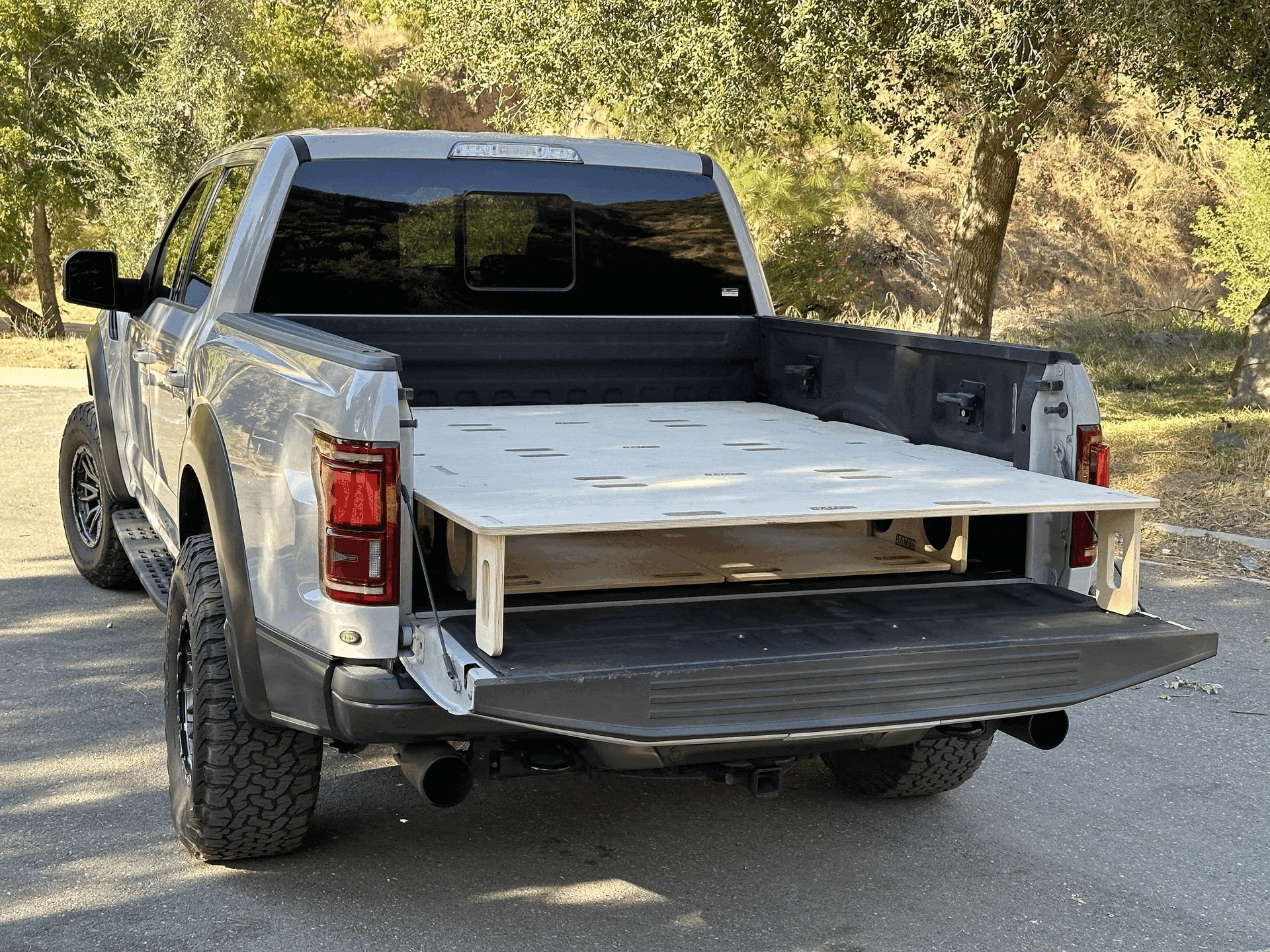 BamBeds Sliders for the F-150 maximize bed space with durable, lightweight birch plywood construction. These removable sliders ensure easy gear access, surpassing bulkier drawer systems in storage space.